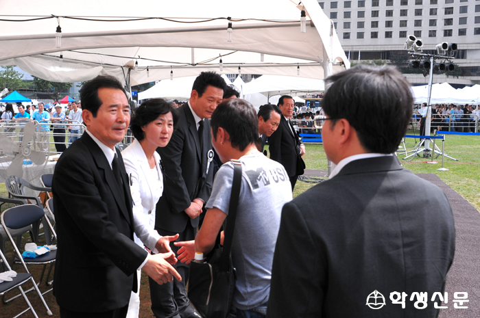 ¹ÎÁÖ´ç Á¤¼¼±Õ ´ëÇ¥¿Í Ãß¹Ì¾Ö ¹ÎÁÖ´ç ±¹È¸ÀÇ¿øÀÌ ½Ã¹Î Á¶¹®°´À» ¸ÂÀÌÇϰí ÀÖ´Ù.